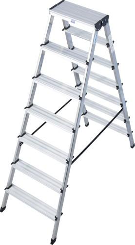 MONTO-универсальная серия. Двусторонняя алюминиевая стремянка с двумя предохранительными ремнями. Прочные боковины из алюминиевой прямоугольной трубы. Профилированные ступеньки шириной 80 мм для безопасного подъема и удобного положения при работе. Многократное прочное заклепочное соединение ступенек с боковинами. Компактная в сложенном состоянии (16 см). Противоскользящие опорные наконечники обеспечивают устойчивое положение.УпаковкаШирина: 530 мм Глубина: 160 мм Высота: 1 640 мм Вес: 7 кг