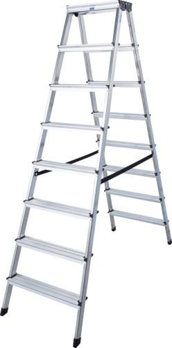 MONTO-универсальная серия. Двусторонняя алюминиевая стремянка с двумя предохранительными ремнями. Прочные боковины из алюминиевой прямоугольной трубы. Профилированные ступеньки шириной 80 мм для безопасного подъема и удобного положения при работе. Многократное прочное заклепочное соединение ступенек с боковинами. Компактная в сложенном состоянии (16 см). Противоскользящие опорные наконечники обеспечивают устойчивое положение.УпаковкаШирина: 550 мм Глубина: 160 мм Высота: 1 870 мм Вес: 8.50 кг