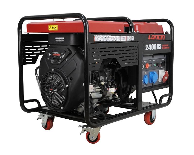 Самая мощная на сегодня модель в линейке бытовых генераторов у компании Loncin, его номинальная мощность составляет 18 кВт. Генератор агрегатирован бензиновым двигателем Loncin 2V90FD, надежным и проверенным временем, хорошо показавшим себя в различных климатических поясах. Крепкая стальная рама защищает генератор от возможных внешних повреждений. Генератор оснащен четырьмя высококачественными колесами с возможностью блокировки для фиксации генератора при работе на неровных поверхностях. Так же в генераторе имеются системы защиты от перегрузки и от недостатка масла в двигателе. Обе этих системы автоматически отключают генератор в случае если наступает соответствующий критический режим во время работы, и не позволяют выйти генератору из строя. Объем топливного бака генератора составляет 40 литров, что позволяет использовать генератор в течение 4,6 часа бесперебойной работы. Несмотря на свою внушительную массу 231,8 килограмм, генератор очень легко перемещать по ровной поверхности, если это будет, скажем, ровный и твердый пол, то укатить генератор, благодаря четырем колесам сможет практически любой взрослый человек, не обладающий специальной физической подготовкой